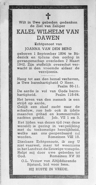 Als politischer Häftling wird er dort am 11. Dezember 1941 mit der Nummer 3.751 im inhaftiert. Vorstrafen: keine, Grund der Inhaftierung: Nach Holland emigriert“, so lautet (indirekt) sein Todesurteil. Der Block 46 wird seine Unterkunft in Buchenwald. Ab dem 16.12.1942 arbeitet van Dawen im Kommando 53 was bedeutet: Arbeit im Steinbruch; ab dem 23.12.1941 erfolgt eine weitere Verschärfung, jetzt ist er „K-Häftling“ bedeutet Strafkompanie Steinbruch.